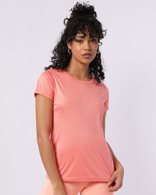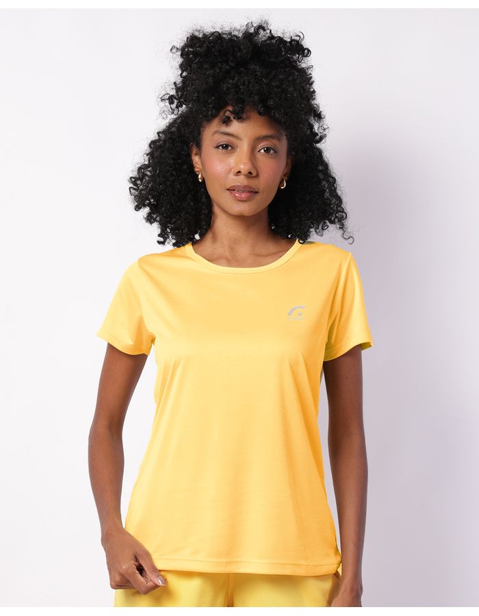 Mais detalhes: Blusa fitness feminina, decote redondo, modelagem básica, pequena estampa com a letra "F" refletivo, manga curta, tecido dry fit leve e fluido, com costura e acabamento padrão.