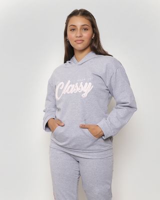 Blusão juvenil confeccionado em tecido moletom. Possui capuz, manga longa, Bordado frontal com escrita "Classy", bolsos frontais estilo canguru, punho e barra simples e acabamento e costura no tom.
