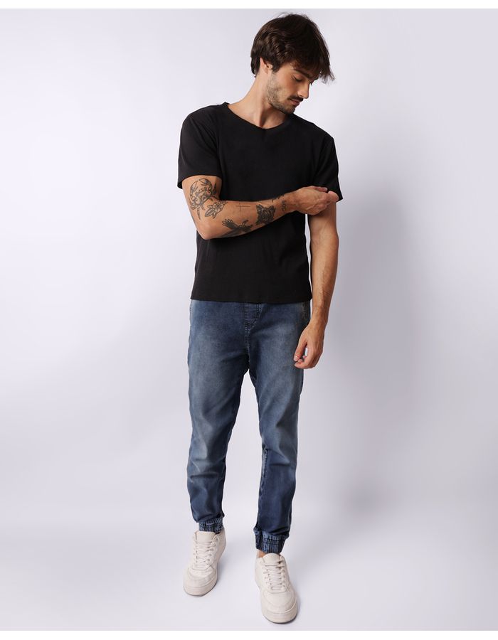 Calça masculina confeccionada em tecido jeans. Possui fechamento frontal por zíper e botão lateral, cós com passante e cordão de ajuste embutido, bolsos laterais e bolsos posteriores. A peça também tem modelagem jogger apresentando barra com elástico.
