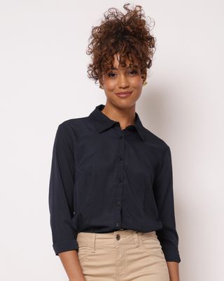 Mais detalhes: Camisa feminina confeccionada em tecido poliéster. Possui modelagem manga longa, abertura frontal por botões , gola dobrável, detalhe abertura com botão nos punhos, acabamento e costura padrão.