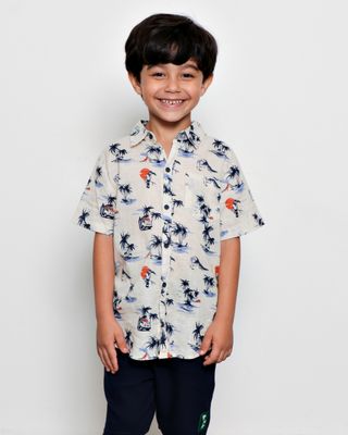 Camisa infantil confeccionada em algodão, possui gola tradicional, manga curta, fechamento por botões, bolso, estampa tropical e barra comum com costura e acabamento padrão.