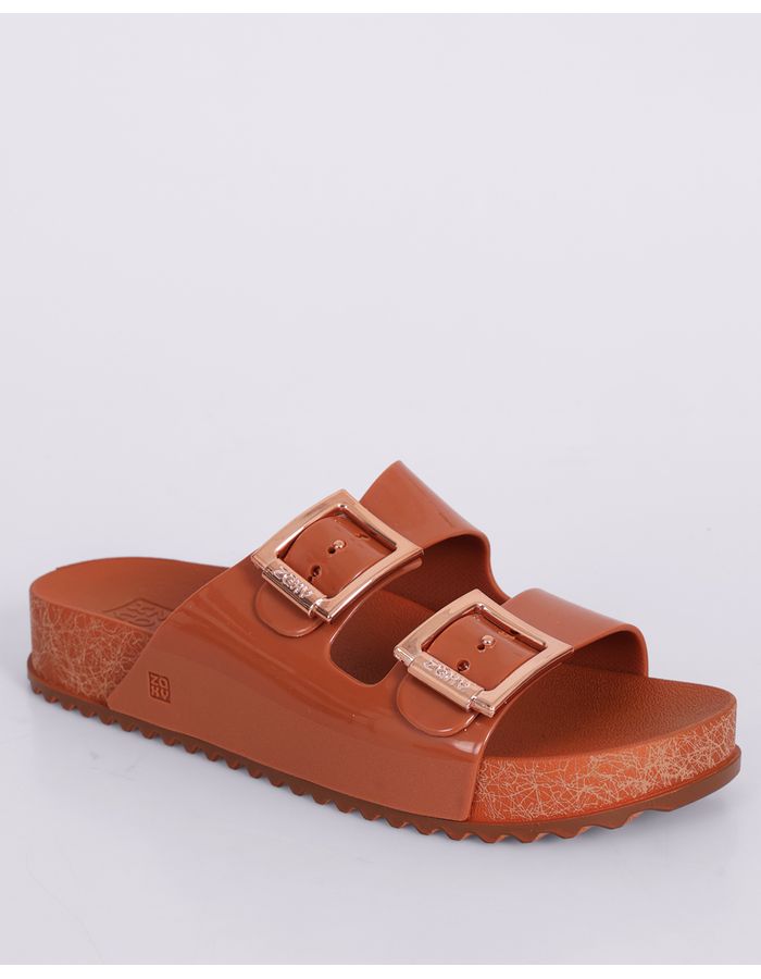 Sandália feminina confeccionada em material sintético. Modelo rasteira, tiras de dedo, detalhe dourado, bico arredondado.