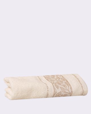 Mais detalhes: Toalha de banho confeccionada em algodão, possui modelagem padrão de 70cm por 130cm, faixa texturizada com arabescos florais com costura e acabamento padrão.
