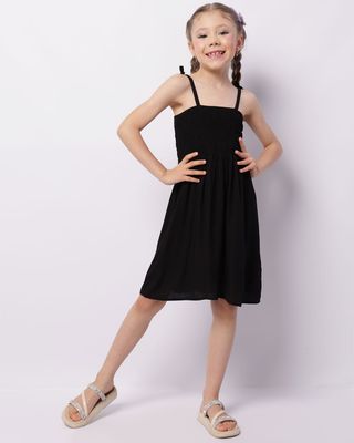 Vestido infantil confeccionado em viscose, possui modelagem curto, alças finas amarráveis, látex na parte posterior e barra comum, com costura e acabamento padrão.